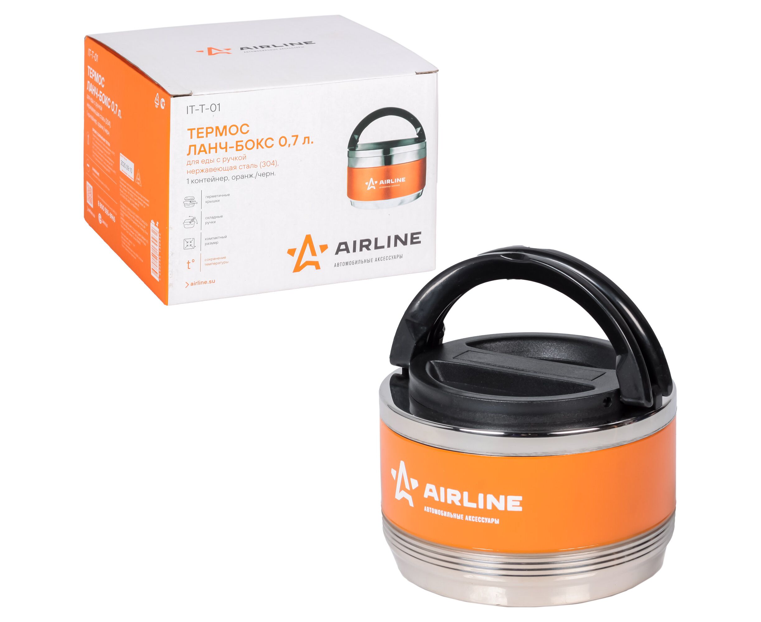 Ланч-бокс для еды с ручкой (термо), нерж. сталь (304), 1 контейнер, 0,7 л., оранж./черн. (AIRLINE)