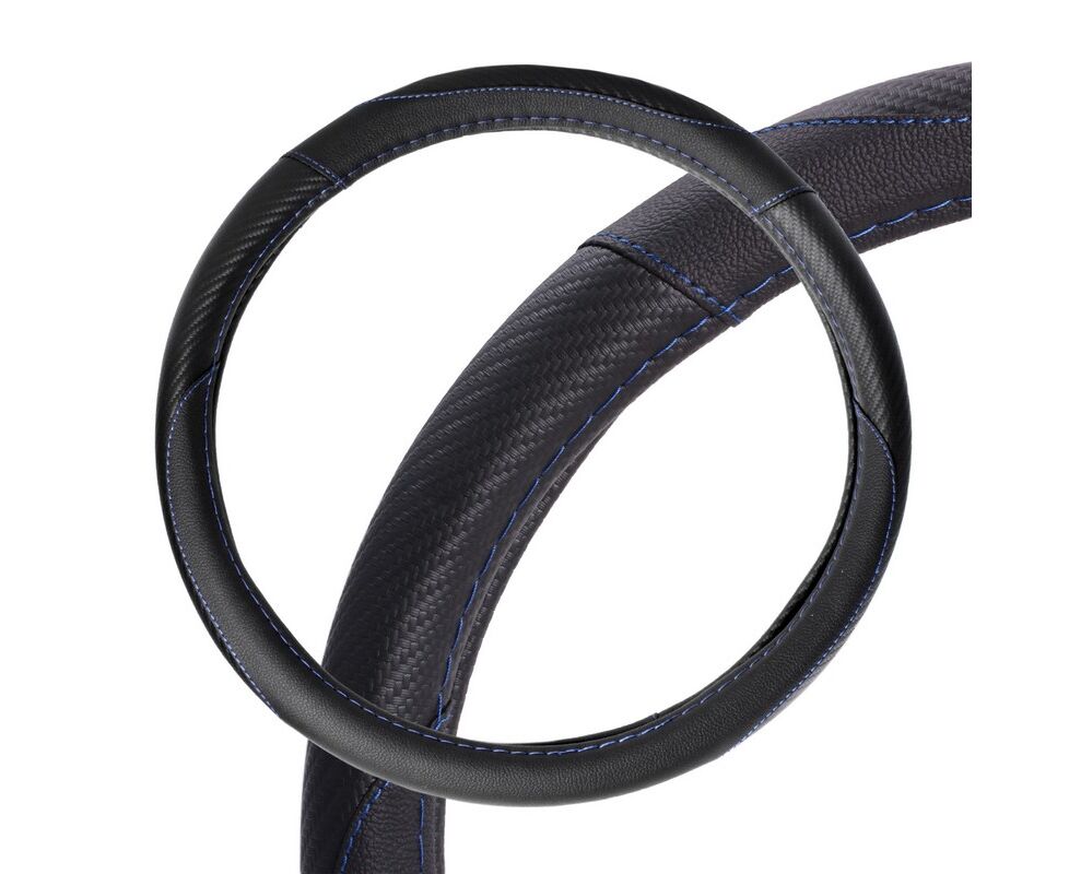 Оплетка на руль "M" 38 см искусст. кожа, текстура карбон, черная с синей прошивкой (AIRLINE) AWS-LI