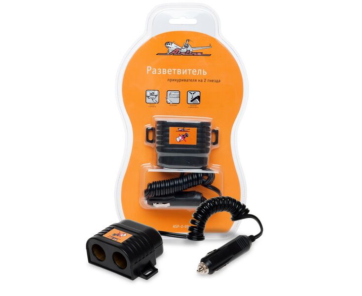Разветвитель прикуривателя 2 гнезда (витой шнур) 12В (AIRLINE) ASP-2-05