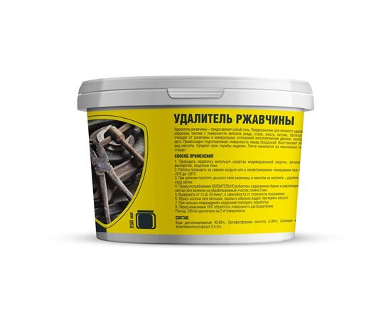 Удалитель ржавчины – представляет собой гель. Предназначен для полного удаления продуктов коррозии, окалин с поверхности металла (медь, сталь, жесть, латунь, бронза). Эффективно очищает от ржавчины и минеральных отложений металлические детали, инструменты, кузов авто. Превосходно подготавливает поверхность перед покраской. Восстановит первоначальный вид металла. Продлит срок службы изделия. Легко наносится на наклонные поверхности, не стекает.