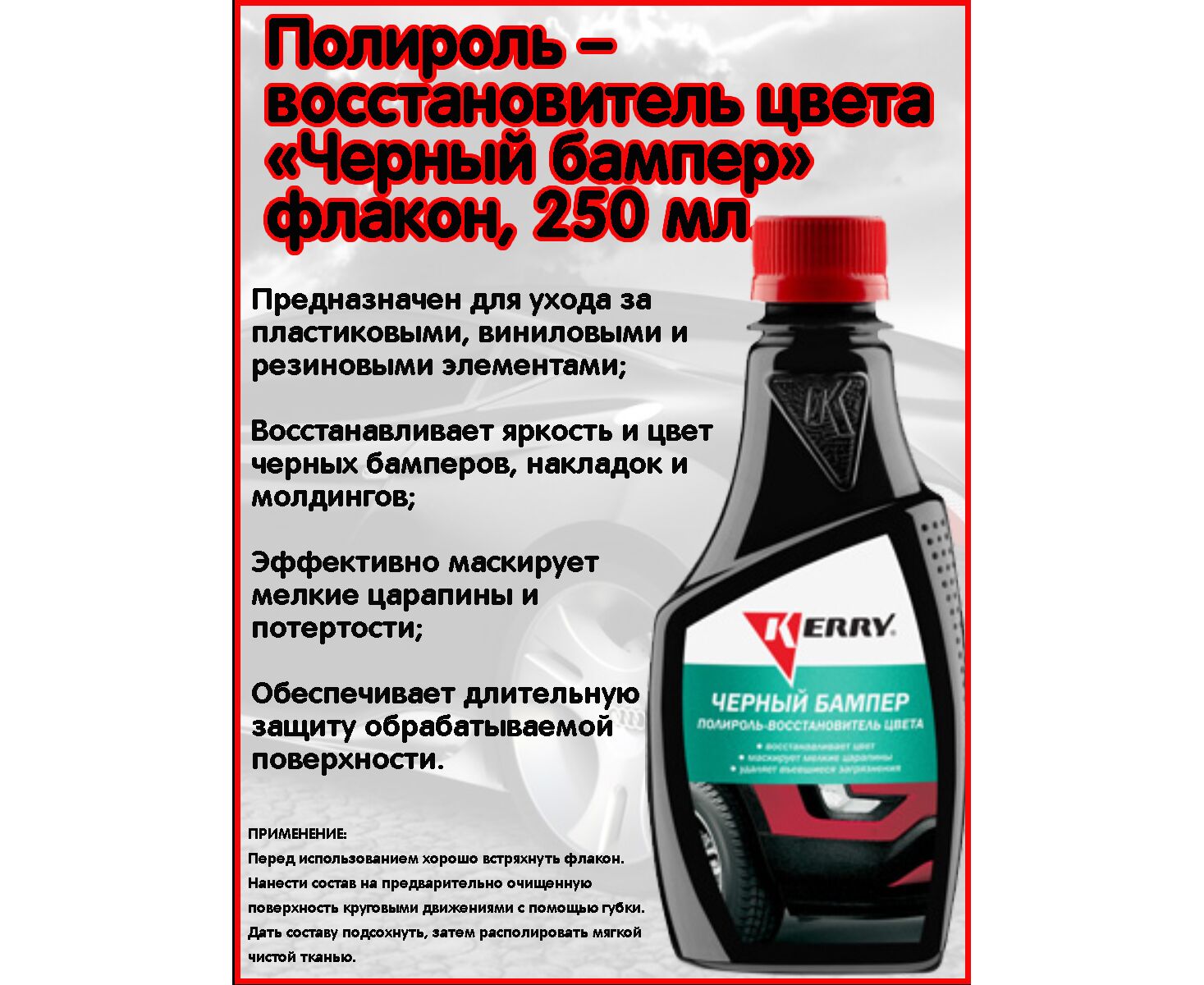 Восстанавливает первоначальную яркость и цвет черных бамперов, накладок и молдингов. Эффективно удаляет въевшиеся загрязнения, следы полироли, маскирует мелкие царапины и потертости. Характеризуется легкостью нанесения и располировки. Обеспечивает длительную защиту обрабатываемой поверхности.