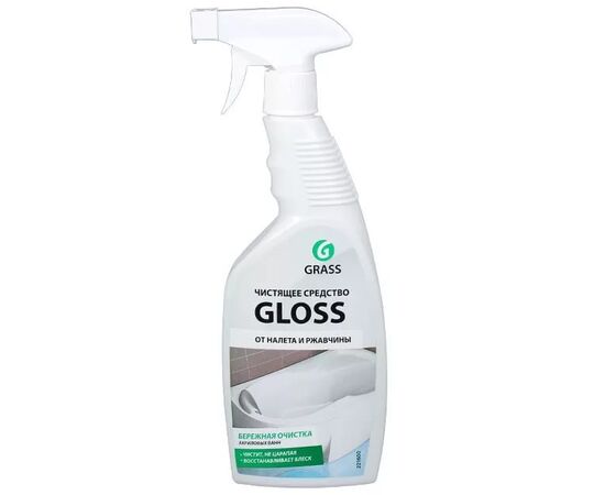 Чистящее средство для ванной комнаты Gloss. Подходит для чистки ванн, душевых кабин, сантехники, фаянсовых изделий и кафеля от известкового налета, потеков ржавчины, мыльных разводов и солевых отложений. Эффективно удаляет сложные и застарелые загрязнения. Безопасно для акриловых ванн. Придает поверхности чистоту и блеск, сохраняя эффект на несколько дней.