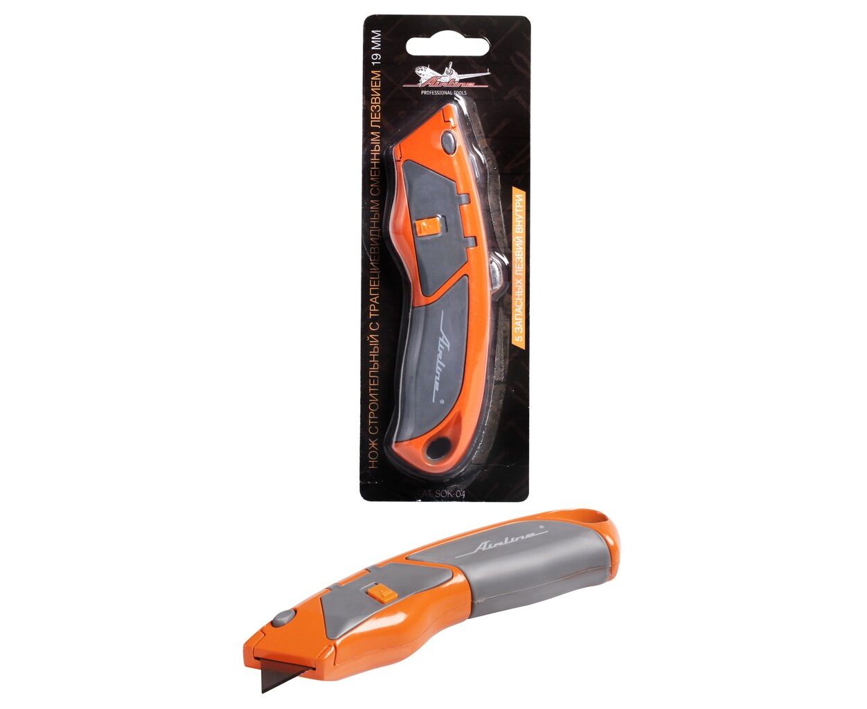 Нож строительный с трапециевидным сменным лезвием 19мм (AIRLINE) AT-SOK-04