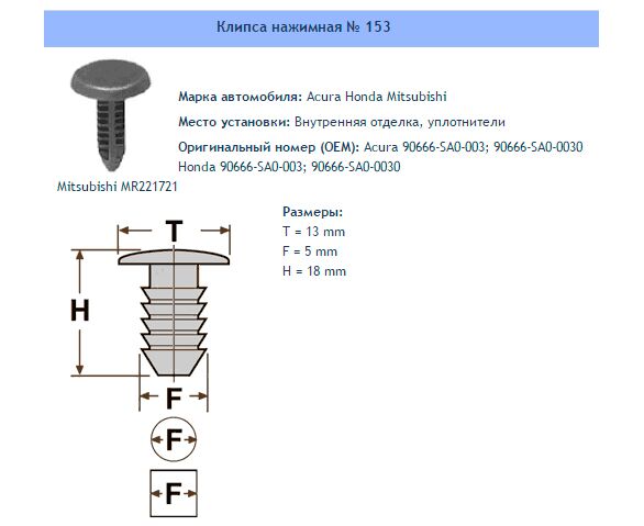 Клипса № 153 Внутренняя отделка, уплотнители Acura Honda Mitsubishi
