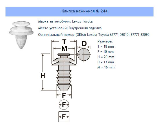 Клипса № 244 Внутренняя обшивка Lexus Toyota