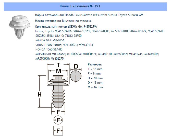 Клипса № 391 Внутренняя отделка Lexus Toyota GM Mitsubishi