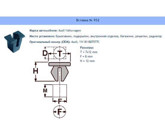Клипса № 952 Брызговики, подкрылки, внутренняя отделка, багажник, решетки, радиатор Audi VW